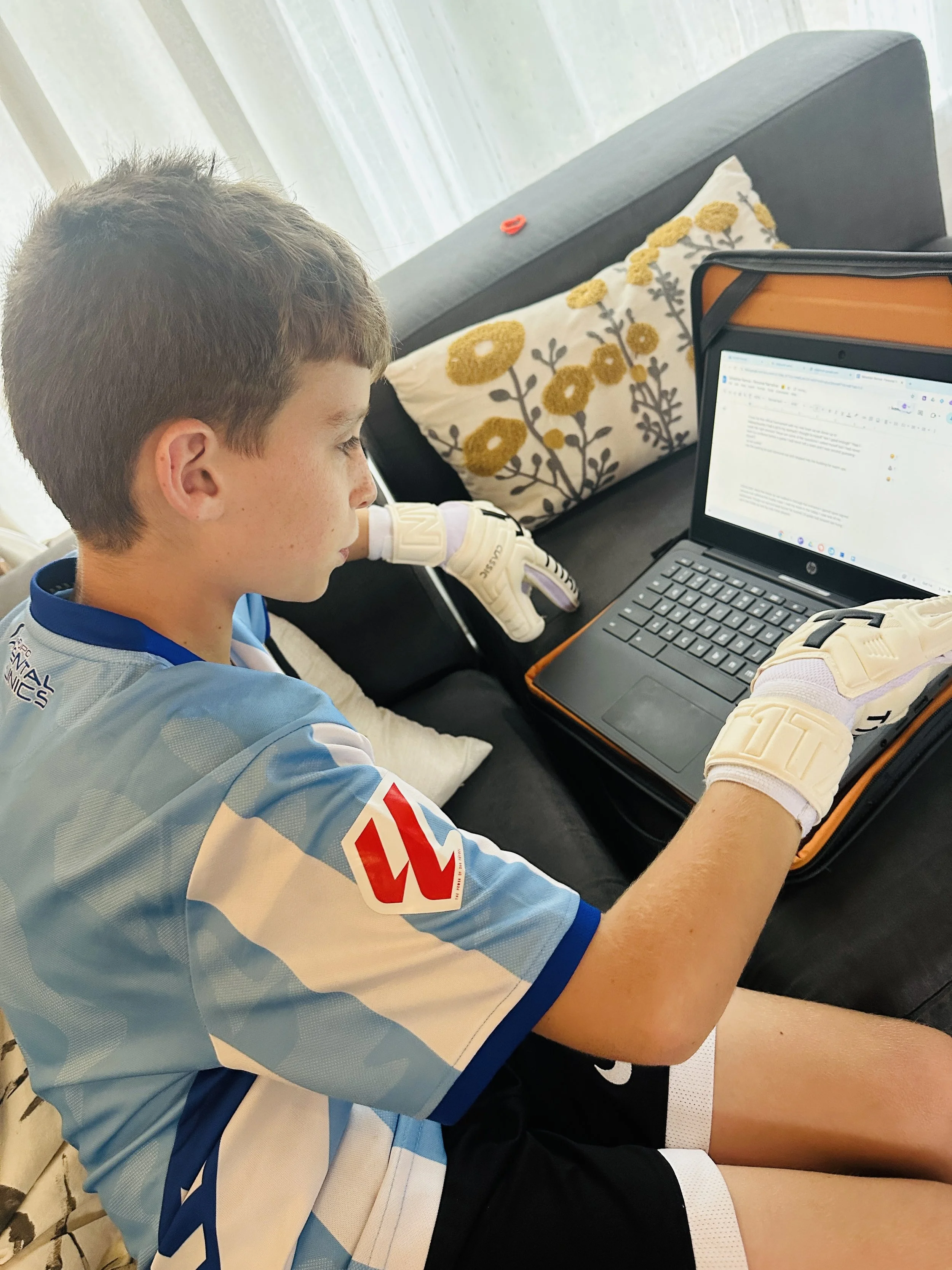Working on his personal narrative while trying on new goalie gloves. In case you’re wondering, yes, it’s harder to type!